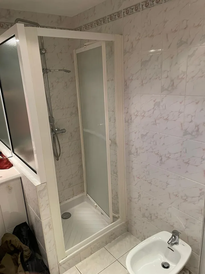 Dépose de l’ancienne installation, remplacement de la paroi, suppression du bidet et reprise du carrelage et de la faïence sur la zone des anciennes fixations et arrivées.