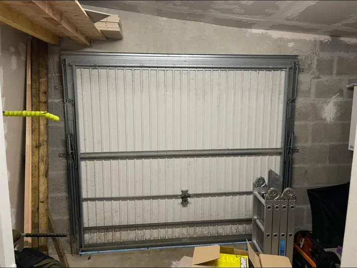 Dépose de l’ancienne porte puis pose d’une nouvelle porte sectionnelle, avec résultat visible côté intérieur et côté extérieur.